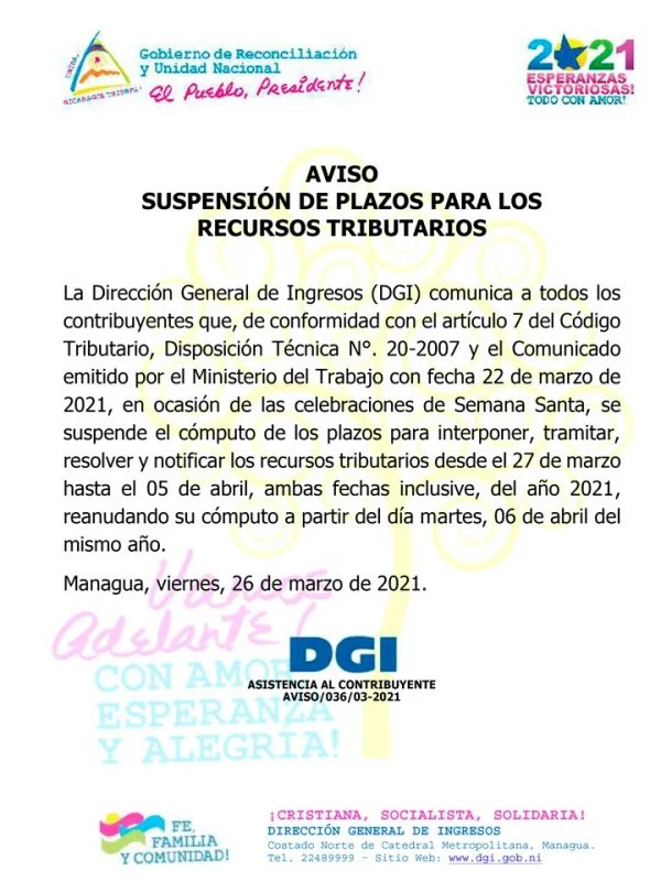 AVISO DE LA DIRECCIÓN GENERAL DE INGRESOS RELATIVO A SUSPENSIÓN DE PLAZOS PARA INTERPONER, TRAMITAR, RESOLVER Y NOTIFICAR RECURSOS TRIBUTARIOS.